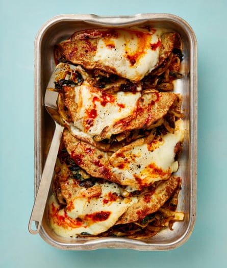 하리사 양배추와 탈레지오를 곁들인 구운 팬케이크 레몬과 설탕만으로는 충분하지 않은 날에는 뒤집는 것보다 재미있는 충전재에 관심을 쏟고 싶습니다. 예를 들어 녹고 끈끈한 치즈와 병에 담긴 매콤한 페이스트가 있습니다. 좋은 품질의 상점에서 구입한 팬케이크를 사용하면 전체 과정이 훨씬 쉬워지지만 약간 부서지기 쉬우므로 채우기 전에 약간, 부드럽게 가열하면 유연성이 유지되고 깨지는 것을 방지할 수 있습니다. 준비 10분 요리 30분 2 인분 무염 버터 100g 폭 3mm로 자른 흰 양배추 ½개(그물 400g) 잘게 썬 밤버섯 250g 어린잎 시금치 200g 로즈마리 가지 3개 잎을 따서 잘게 다진 것 고운 바다소금과 후추 2작은술 장미 2작은술 하리사 페이스트 와 병에 있는 기름 ½ 티스푼( 상점에서 구입한 플..