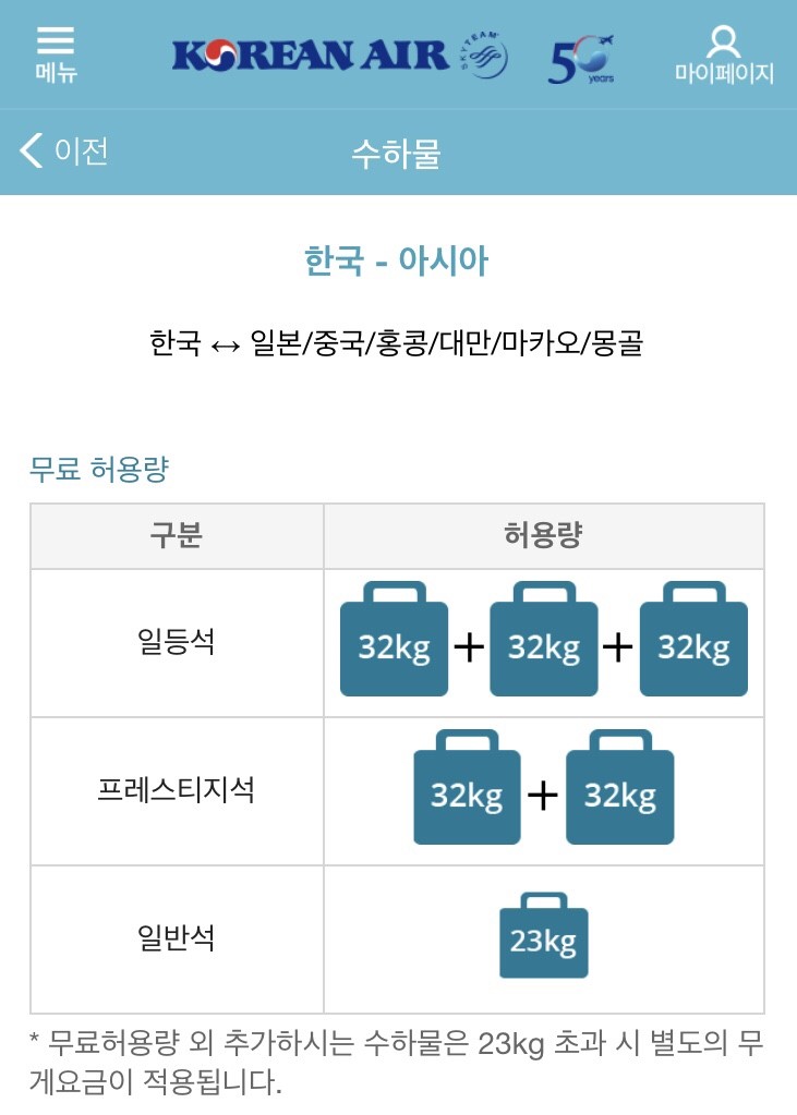 수하물은 항공사마다 상이하니 반드시 여행전 확인해야합니다.