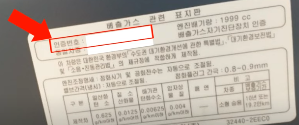 ( 보닛을 열고 배출가스 관련 표지판 인증번호 확인 )