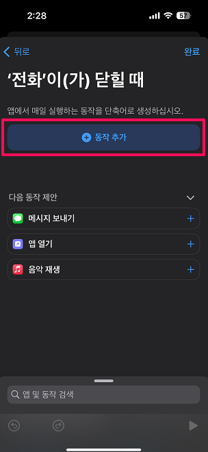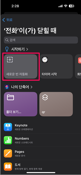 단축어 / 하단 / 자동화 클릭 / 새로운 자동화 / 앱 검색 / 전화 선택 / 닫힐 때 선택 / 즉시 실행 / 다음 / 새로운 빈 자동화 / 동작추가 / 홈화면으로 이동